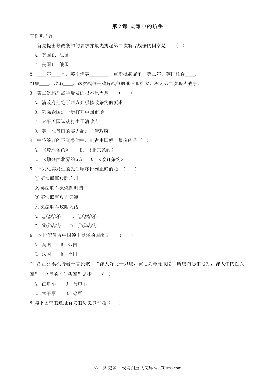 第2课劫难中的抗争基础巩固题1.首先提出修改条约的要求并最先挑起第二次鸦片战争的国家是()A.英国B.法国C.美国D.俄国2.年月,英军炮轰,重新挑起战争,第二年,英国联合,组成,攻陷。这次战争是鸦片战争的...