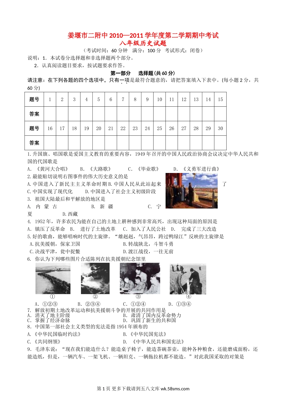 姜堰市二附中2010—2011学年度第二学期期中考试八年级历史试题(考试时间:60分钟满分:100分考试形式:闭卷)说明:1.本试卷分选择题和非选择题两个部分。2.认真阅读题目要求,按试题要求作答。第一部分选择题...