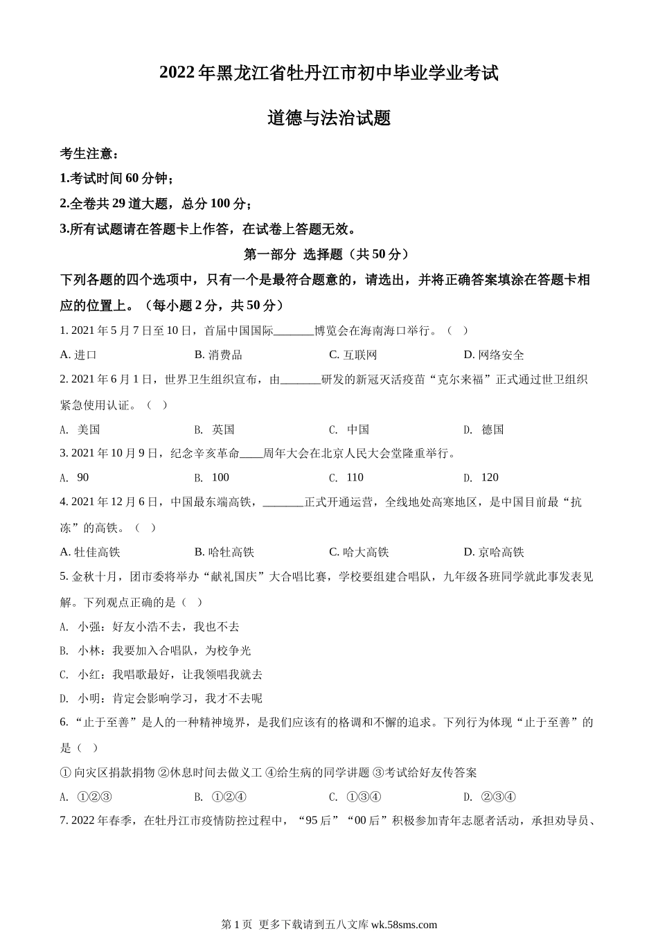 2022年黑龙江省牡丹江市初中毕业学业考试道德与法治试题考生注意:1.考试时间60分钟;2.全卷共29道大题,总分100分;3.所有试题请在答题卡上作答,在试卷上答题无效。第一部分选择题(共50分)下列各题的四个选项...