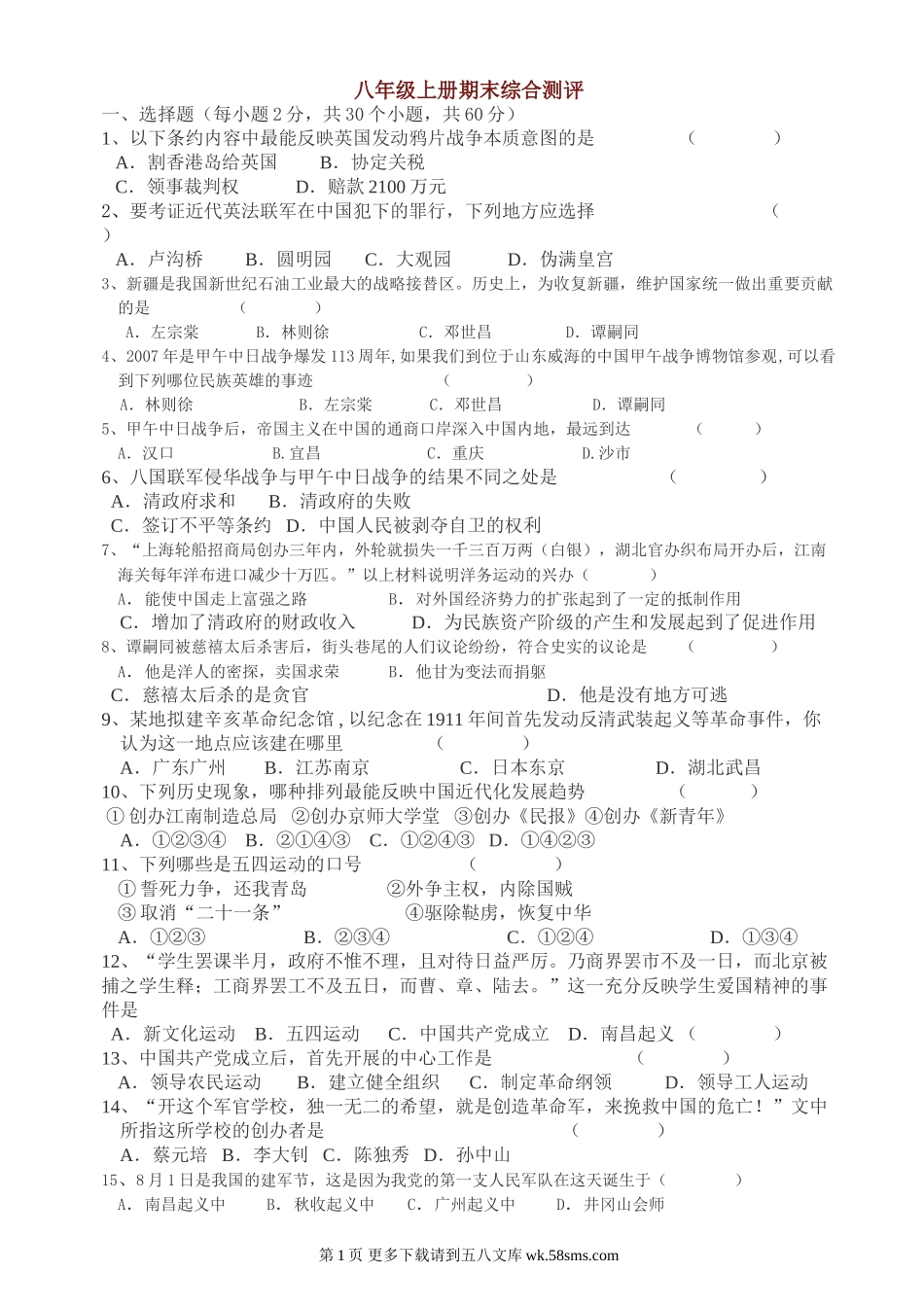 八年级上册期末综合测评一、选择题(每小题2分,共30个小题,共60分)1、以下条约内容中最能反映英国发动鸦片战争本质意图的是()A.割香港岛给英国B.协定关税C.领事裁判权D.赔款2100万元2、要考证近代英法联...