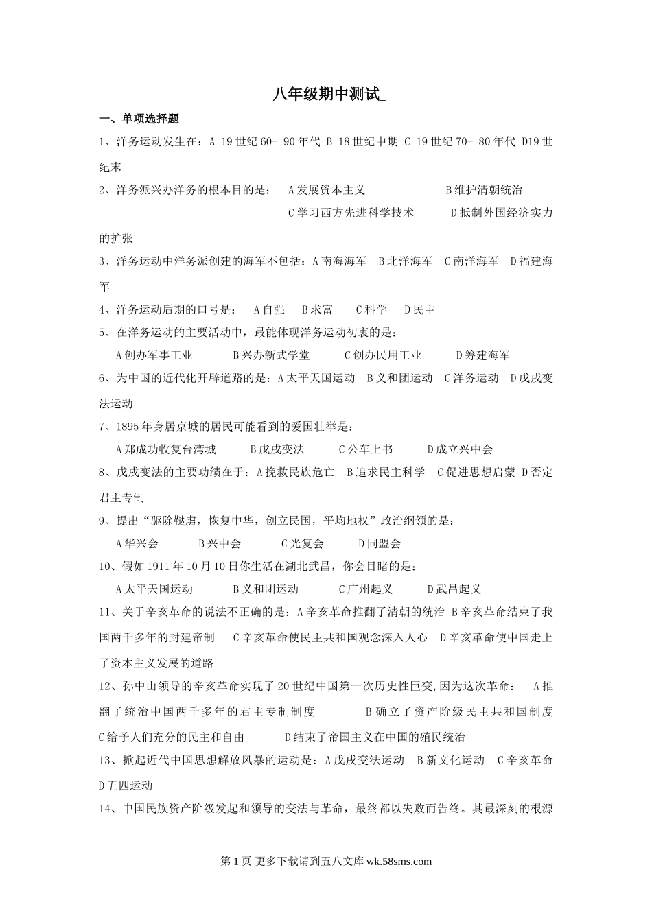八年级期中测试一、单项选择题1、洋务运动发生在:A19世纪60-90年代B18世纪中期C19世纪70-80年代D19世纪末2、洋务派兴办洋务的根本目的是:A发展资本主义B维护清朝统治C学习西方先进科学技术D抵制外国经济实力的...