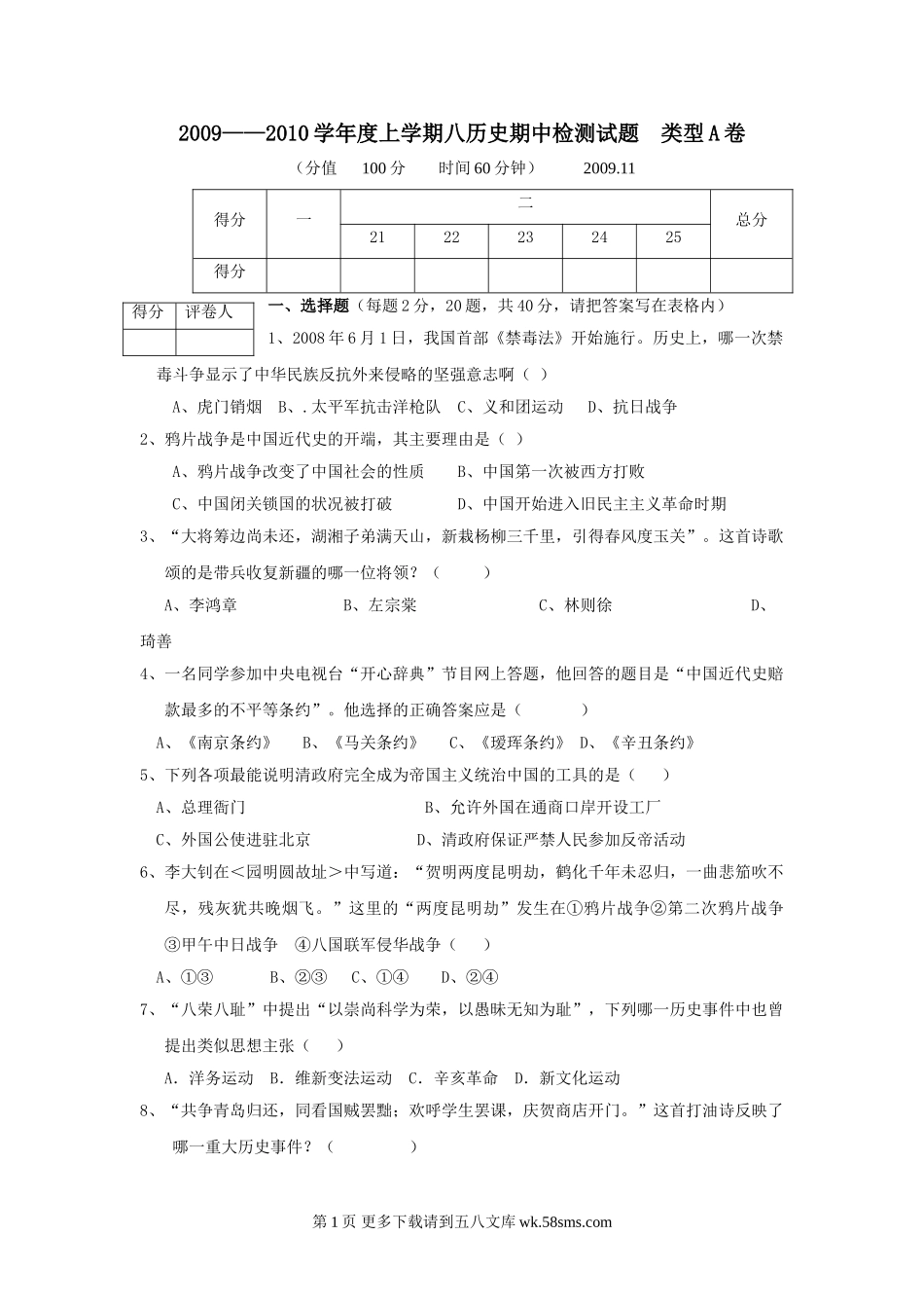 2009——2010学年度上学期八历史期中检测试题类型A卷(分值100分时间60分钟)2009.11得分一二总分2122232425得分一、选择题(每题2分,20题,共40分,请把答案写在表格内)1、2008年6月1日,我国首部《禁毒法》开...