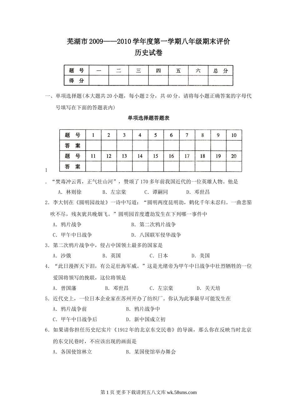 芜湖市2009——2010学年度第一学期八年级期末评价历史试卷一、单项选择题(本大题共20小题,每小题2分,共40分。请将每小题正确答案的字母代号填写在下面的答题表内)单项选择题答题表1.“焚毒冲云霄,正气壮山河...