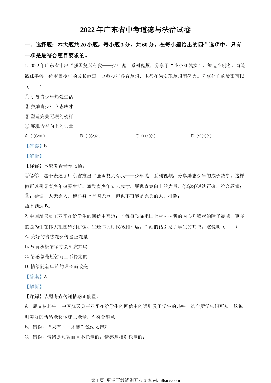 2022年广东省中考道德与法治真题(解析版).docx