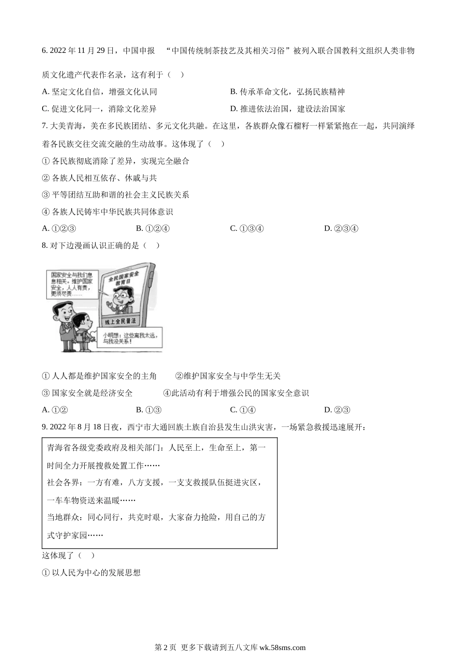 2023年青海省中考道德与法治真题(原卷版).docx_第2页
