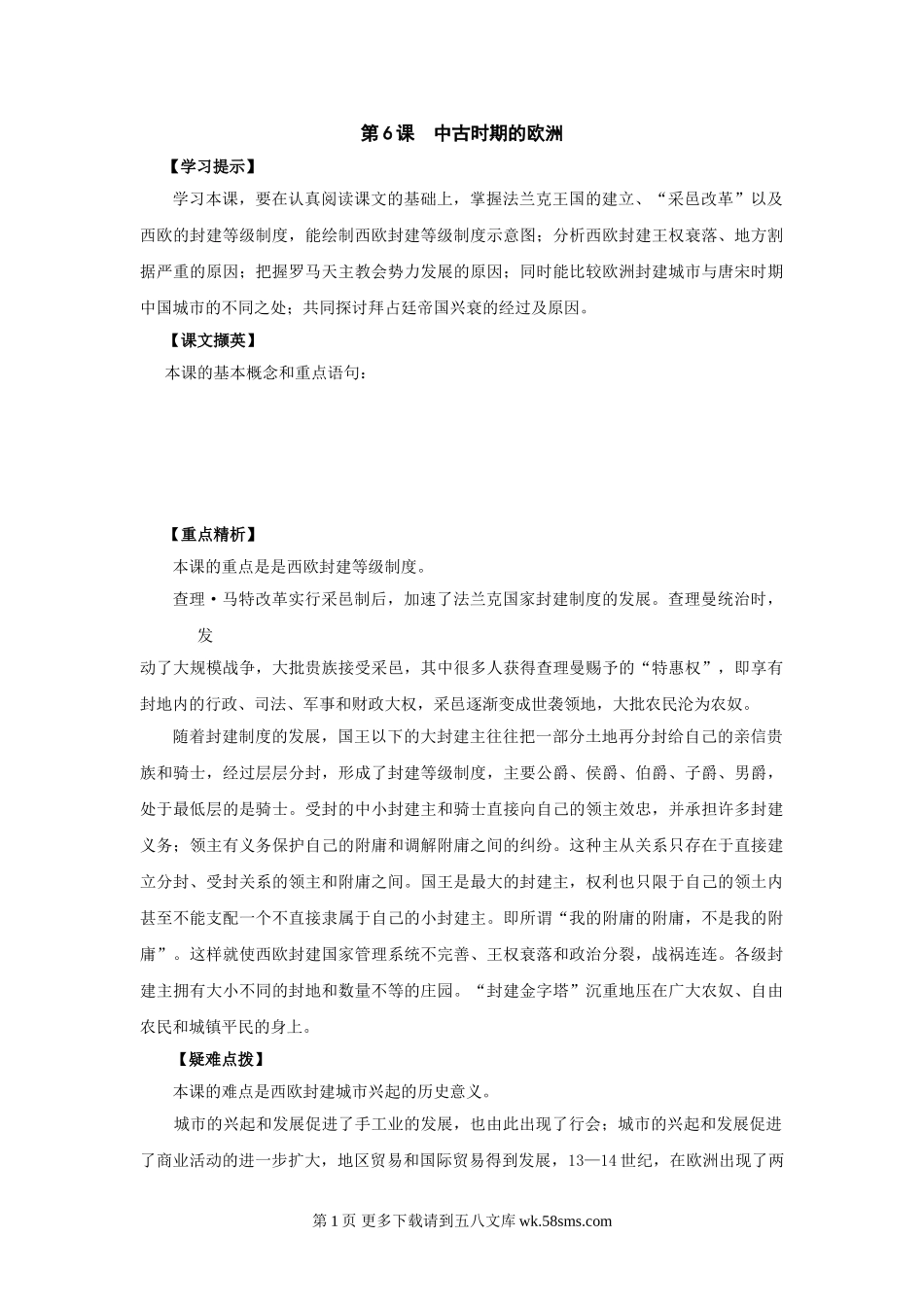 第6课中古时期的欧洲【学习提示】学习本课,要在认真阅读课文的基础上,掌握法兰克王国的建立、“采邑改革”以及西欧的封建等级制度,能绘制西欧封建等级制度示意图;分析西欧封建王权衰落、地方割据严重的原因;...