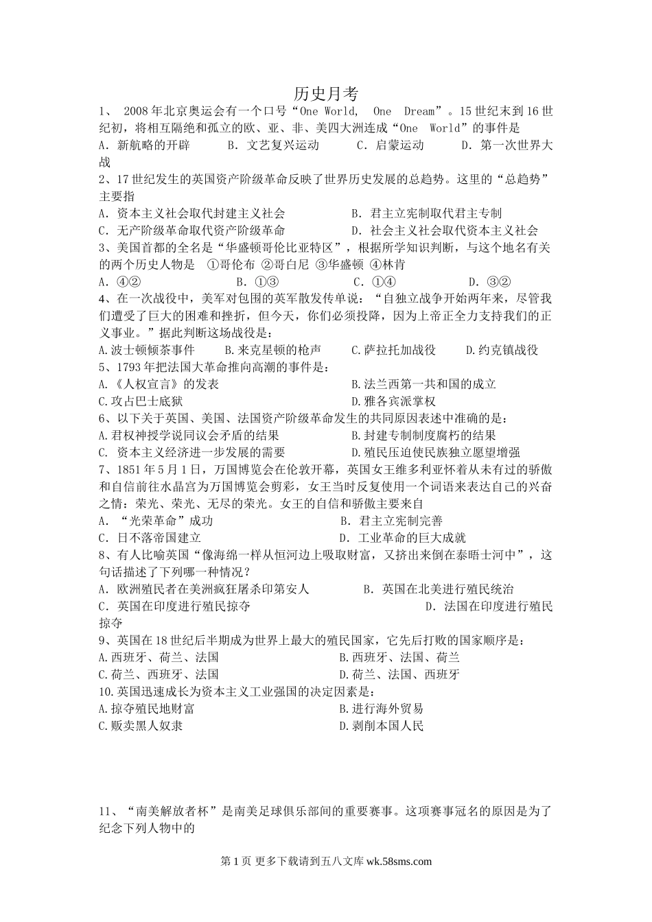 历史月考1、2008年北京奥运会有一个口号“OneWorld,OneDream”。15世纪末到16世纪初,将相互隔绝和孤立的欧、亚、非、美四大洲连成“OneWorld”的事件是A.新航略的开辟B.文艺复兴运动C.启蒙运动D.第一次世界...