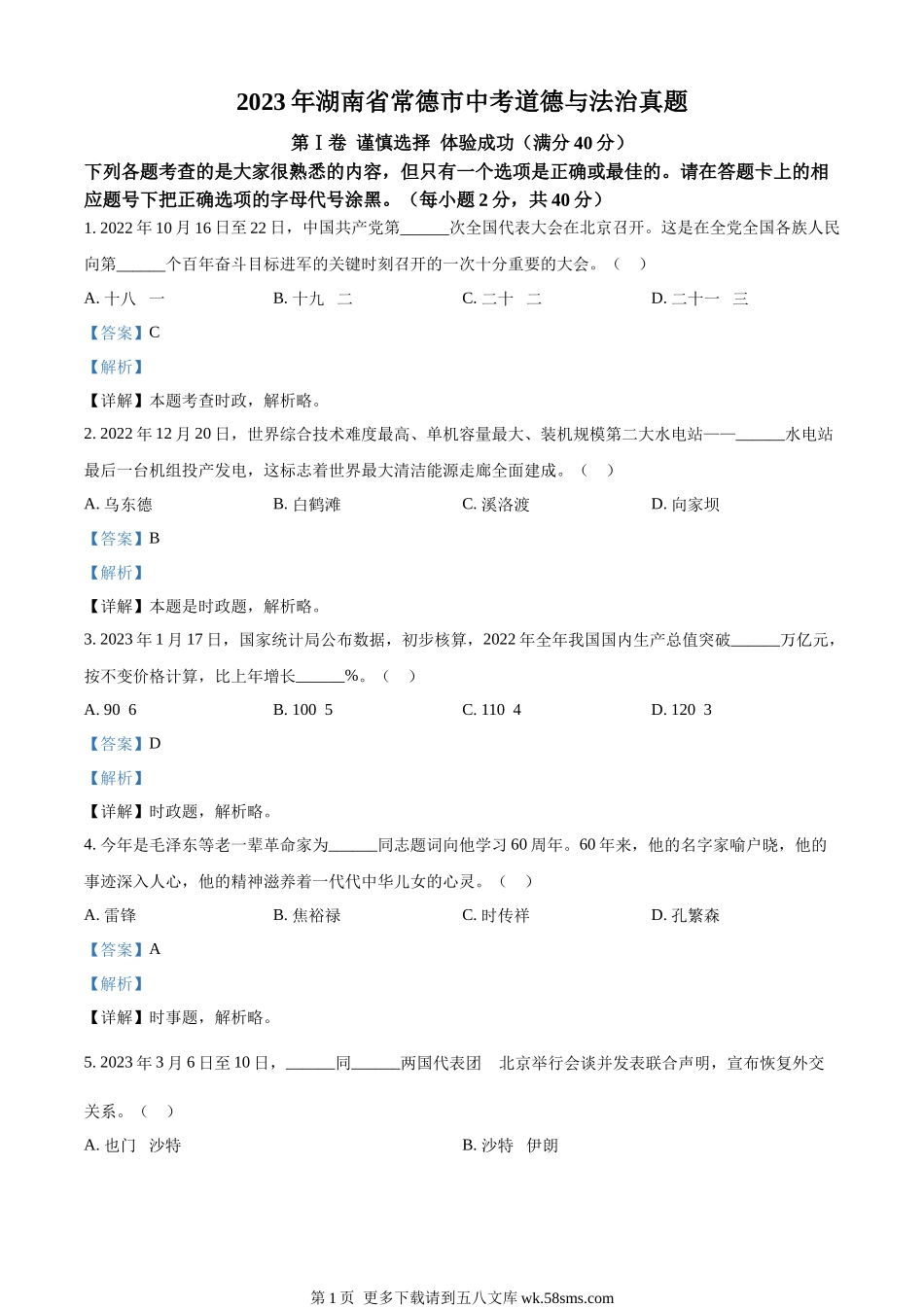 2023年湖南省常德市中考道德与法治真题第Ⅰ卷谨慎选择体验成功(满分40分)下列各题考查的是大家很熟悉的内容,但只有一个选项是正确或最佳的。请在答题卡上的相应题号下把正确选项的字母代号涂黑。(每小题2分,...