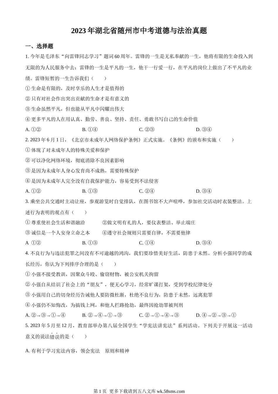2023年湖北省随州市中考道德与法治真题一、选择题1.今年是毛泽东“向雷锋同志学习”题词60周年。雷锋的一生是无私奉献的一生,他将有限的生命投入到无限的为人民服务中去:雷锋的一生是平凡的一生,他干一行爱一...