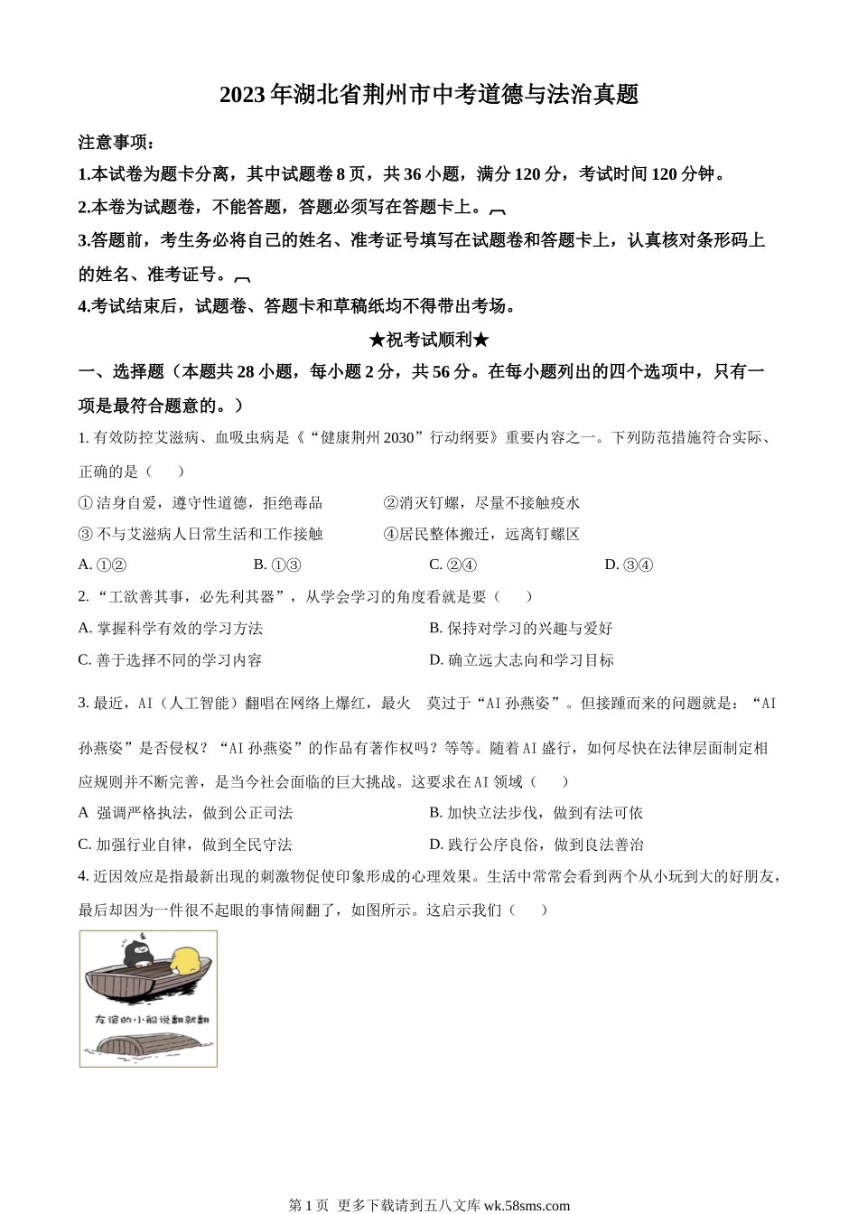 2023年湖北省荆州市中考道德与法治真题注意事项:1.本试卷为题卡分离,其中试题卷8页,共36小题,满分120分,考试时间120分钟。2.本卷为试题卷,不能答题,答题必须写在答题卡上。3.答题前,考生务必将自己的姓...