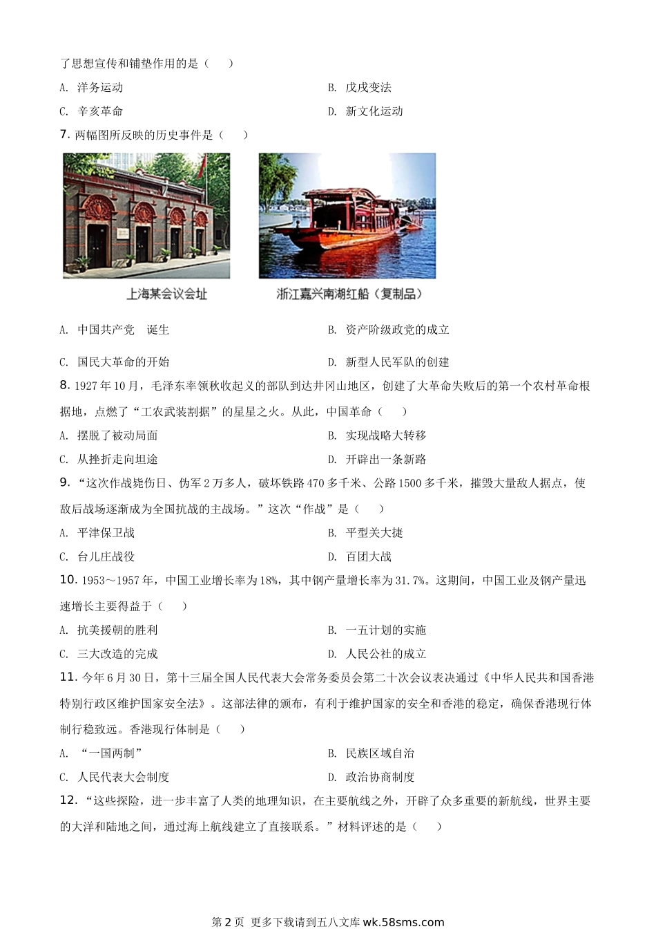 广西自治区百色市2020年中考历史试题(原卷版).docx_第2页
