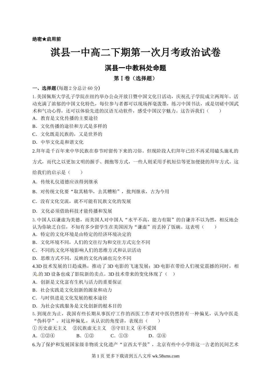 绝密★启用前淇县一中高二下期第一次月考政治试卷淇县一中教科处命题第Ⅰ卷(选择题)一、选择题(每题2分总计60分)1.美国佩斯大学孔子学院在纽约举办公众开放日暨中国文化日活动,庆祝孔子学院成立两周年。活动充...