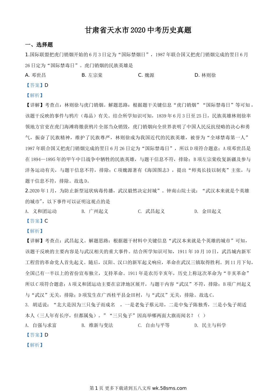 甘肃省天水市2020中考历史真题一、选择题1.国际联盟把虎门销烟开始的6月3日定为“国际禁烟日”,1987年联合国又把虎门销烟完成的翌日6月26日定为“国际禁毒日”。虎门销烟的民族英雄是A.邓世昌B.左宗棠C.魏源D.林...