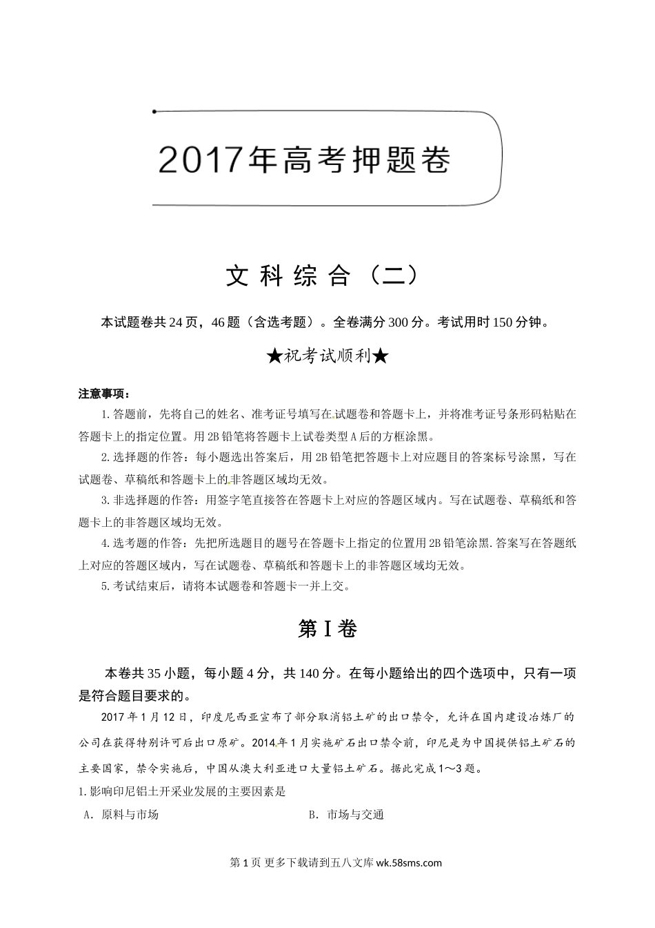 文科综合(二)本试题卷共24页,46题(含选考题)。全卷满分300分。考试用时150分钟。★祝考试顺利★注意事项:1.答题前,先将自己的姓名、准考证号填写在试题卷和答题卡上,并将准考证号条形码粘贴在答题卡上的...