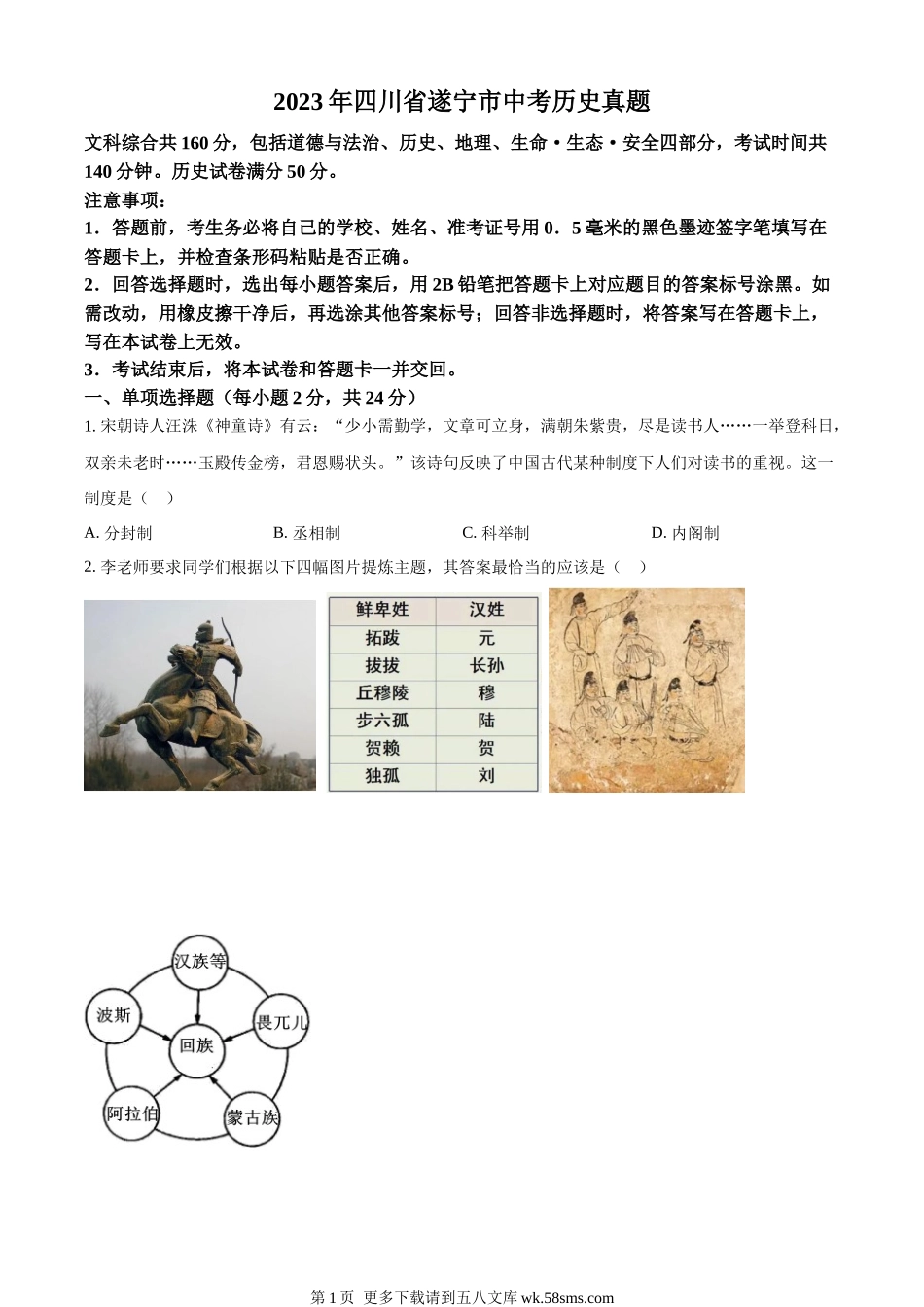2023年四川省遂宁市中考历史真题文科综合共160分,包括道德与法治、历史、地理、生命·生态·安全四部分,考试时间共140分钟。历史试卷满分50分。注意事项:1.答题前,考生务必将自己的学校、姓名、准考证号用0...