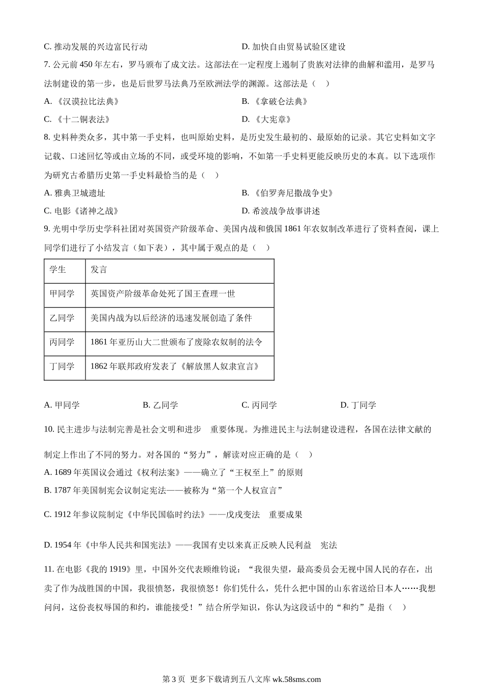 2023年四川省遂宁市中考历史真题(原卷版).docx_第3页