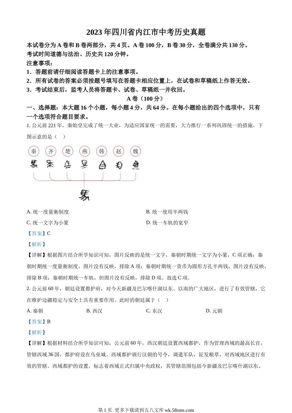 2023年四川省内江市中考历史真题本试卷分为A卷和B卷两部分,共4页。A卷100分,B卷30分,全卷满分共130分。考试时间道德与法治、历史共120分钟。注意事项:1.答题前请仔细阅读答题卡上的注意事项。2.所有试卷的...