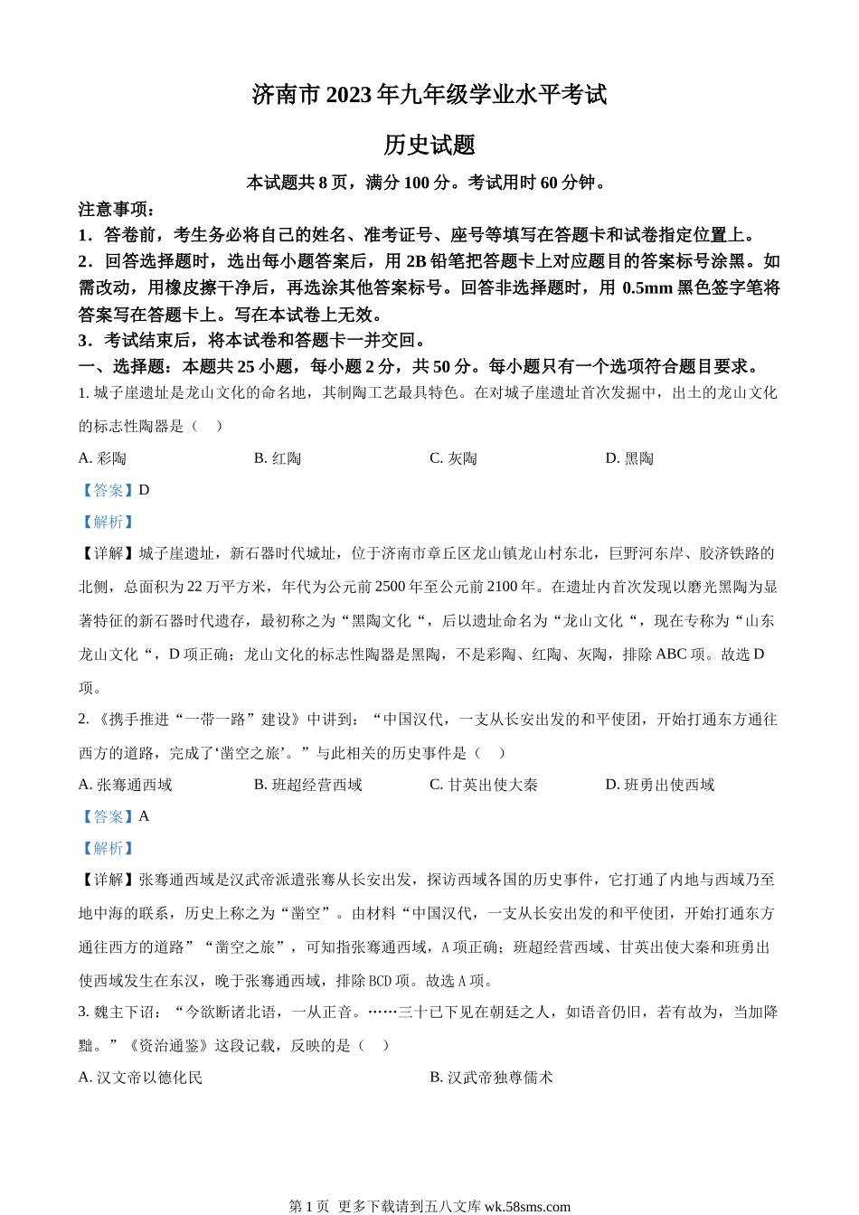 济南市2023年九年级学业水平考试历史试题本试题共8页,满分100分。考试用时60分钟。注意事项:1.答卷前,考生务必将自己的姓名、准考证号、座号等填写在答题卡和试卷指定位置上。2.回答选择题时,选出每小题答...