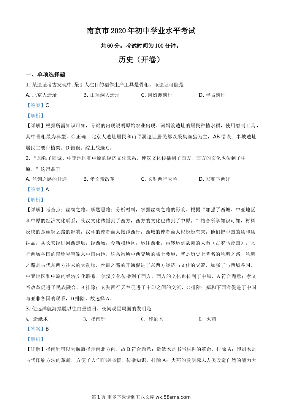 南京市2020年初中学业水平考试共60分。考试时间为100分钟。历史(开卷)一、单项选择题1.某遗址考古发现中.最引人注目的稻作生产工具是骨耜。该遗址可能是A.北京人遗址B.山顶洞人遗址C.河姆渡遗址D.半坡遗址【答...