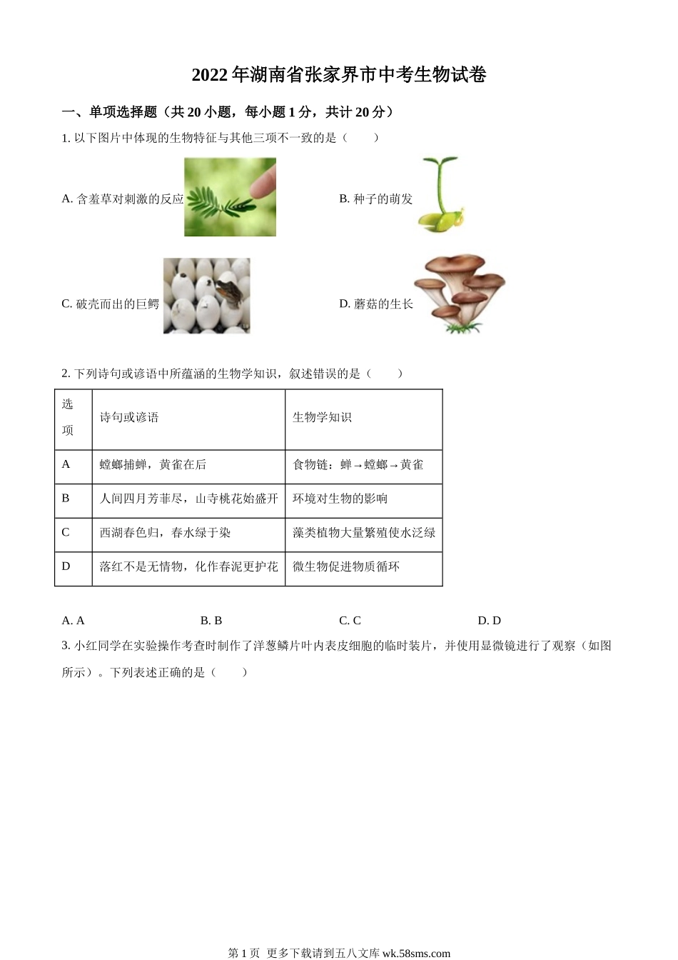 2022年湖南省张家界市中考生物试卷一、单项选择题(共20小题,每小题1分,共计20分)1.以下图片中体现的生物特征与其他三项不一致的是()A.含羞草对刺激的反应B.种子的萌发C.破壳而出的巨鳄D.蘑菇的生长2.下列诗...