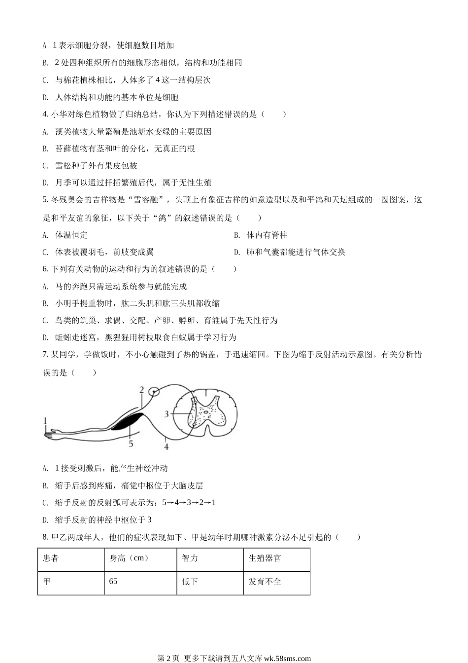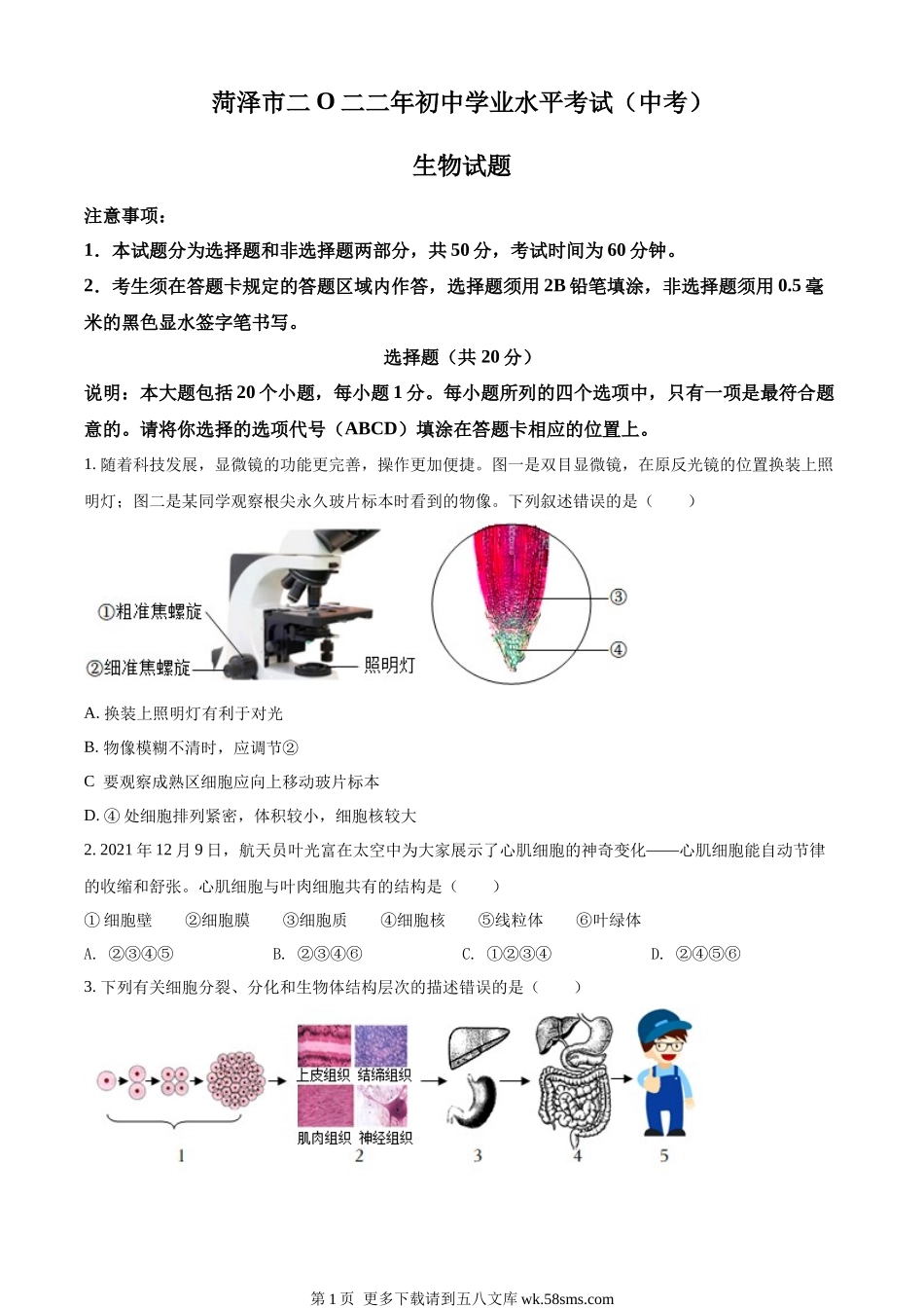 菏泽市二O二二年初中学业水平考试(中考)生物试题注意事项:1.本试题分为选择题和非选择题两部分,共50分,考试时间为60分钟。2.考生须在答题卡规定的答题区域内作答,选择题须用2B铅笔填涂,非选择题须用0.5...