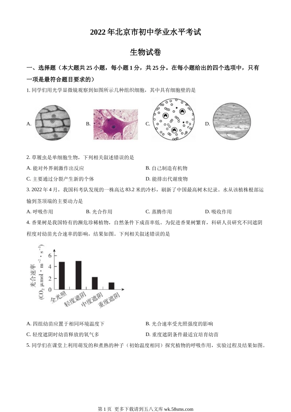 2022年北京市初中学业水平考试生物试卷一、选择题(本大题共25小题,每小题1分,共25分。在每小题给出的四个选项中,只有一项是最符合题目要求的)1.同学们用光学显微镜观察到如图所示几种组织细胞,其中具有细胞...