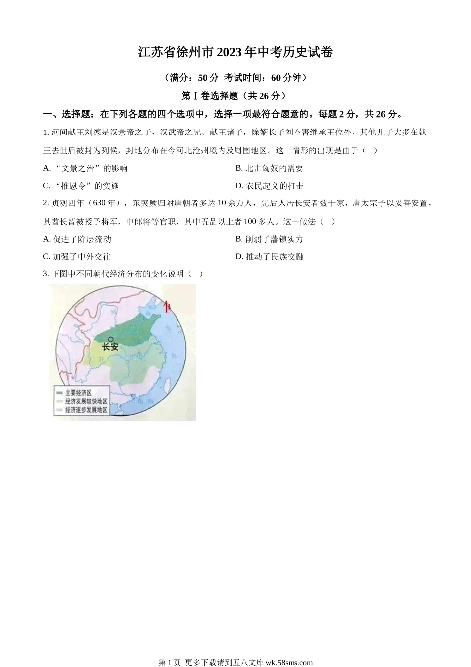 江苏省徐州市2023年中考历史试卷(满分:50分考试时间:60分钟)第Ⅰ卷选择题(共26分)一、选择题:在下列各题的四个选项中,选择一项最符合题意的。每题2分,共26分。1.河间献王刘德是汉景帝之子,汉武帝之兄。...