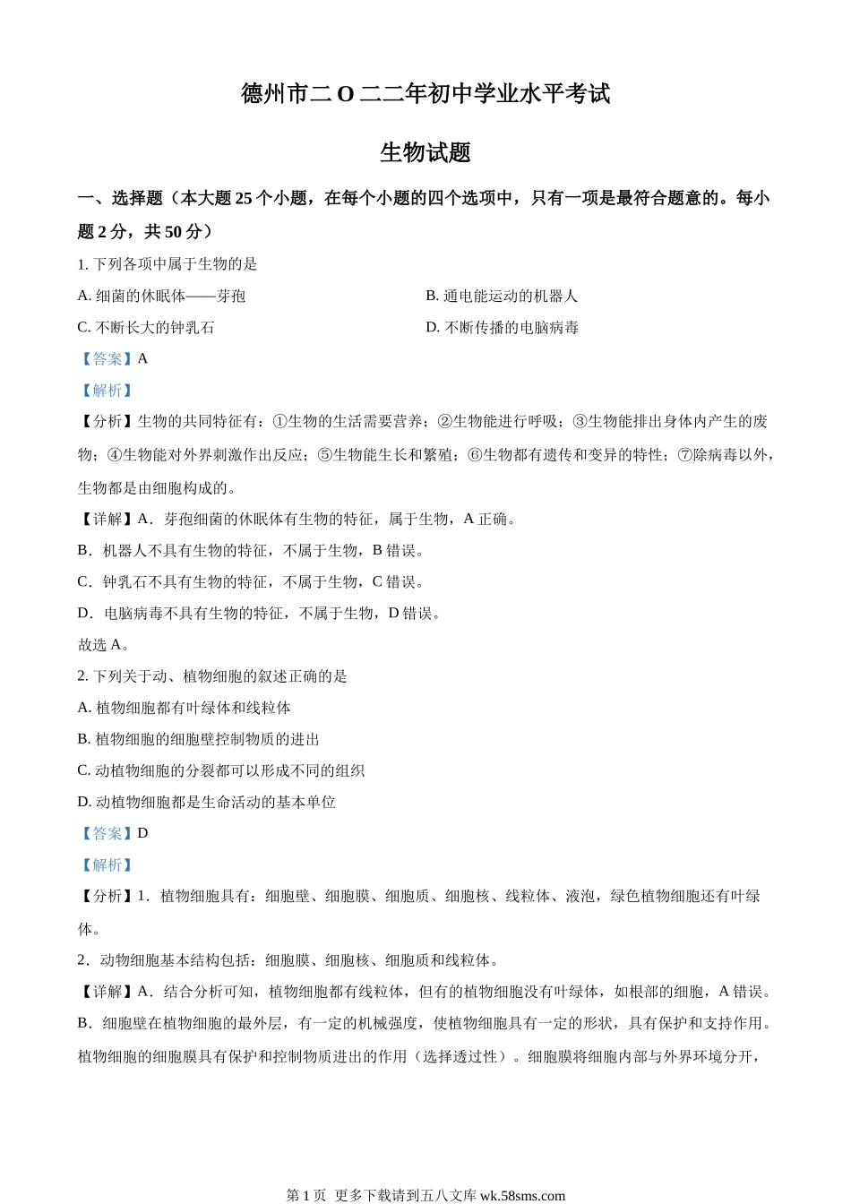 德州市二O二二年初中学业水平考试生物试题一、选择题(本大题25个小题,在每个小题的四个选项中,只有一项是最符合题意的。每小题2分,共50分)1.下列各项中属于生物的是A.细菌的休眠体——芽孢B.通电能运动的机...