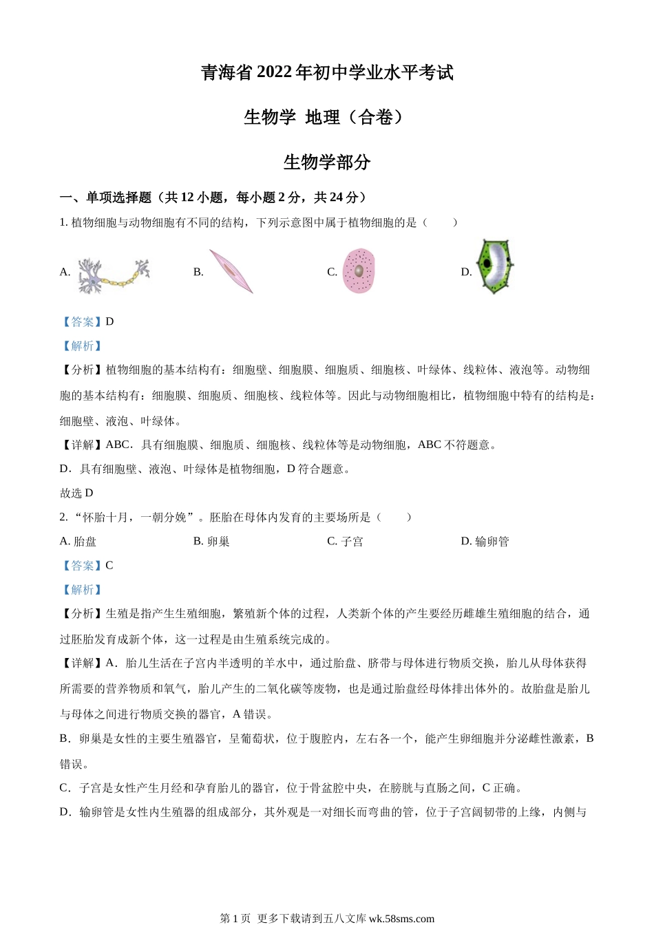 青海省2022年初中学业水平考试生物学地理(合卷)生物学部分一、单项选择题(共12小题,每小题2分,共24分)1.植物细胞与动物细胞有不同的结构,下列示意图中属于植物细胞的是()A.B.C.D.【答案】D【解析】【分...