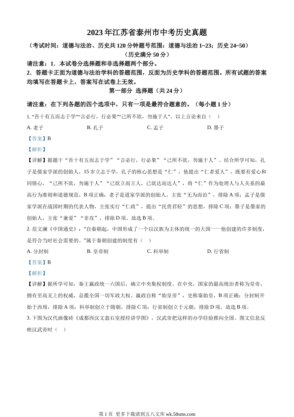 2023年江苏省泰州市中考历史真题(考试时间:道德与法治、历史共120分钟题号范围:道德与法治1~23;历史24~50)(历史满分50分)请注意:1.本试卷分选择题和非选择题两个部分。2.答题卡正面为道德与法治学科的...