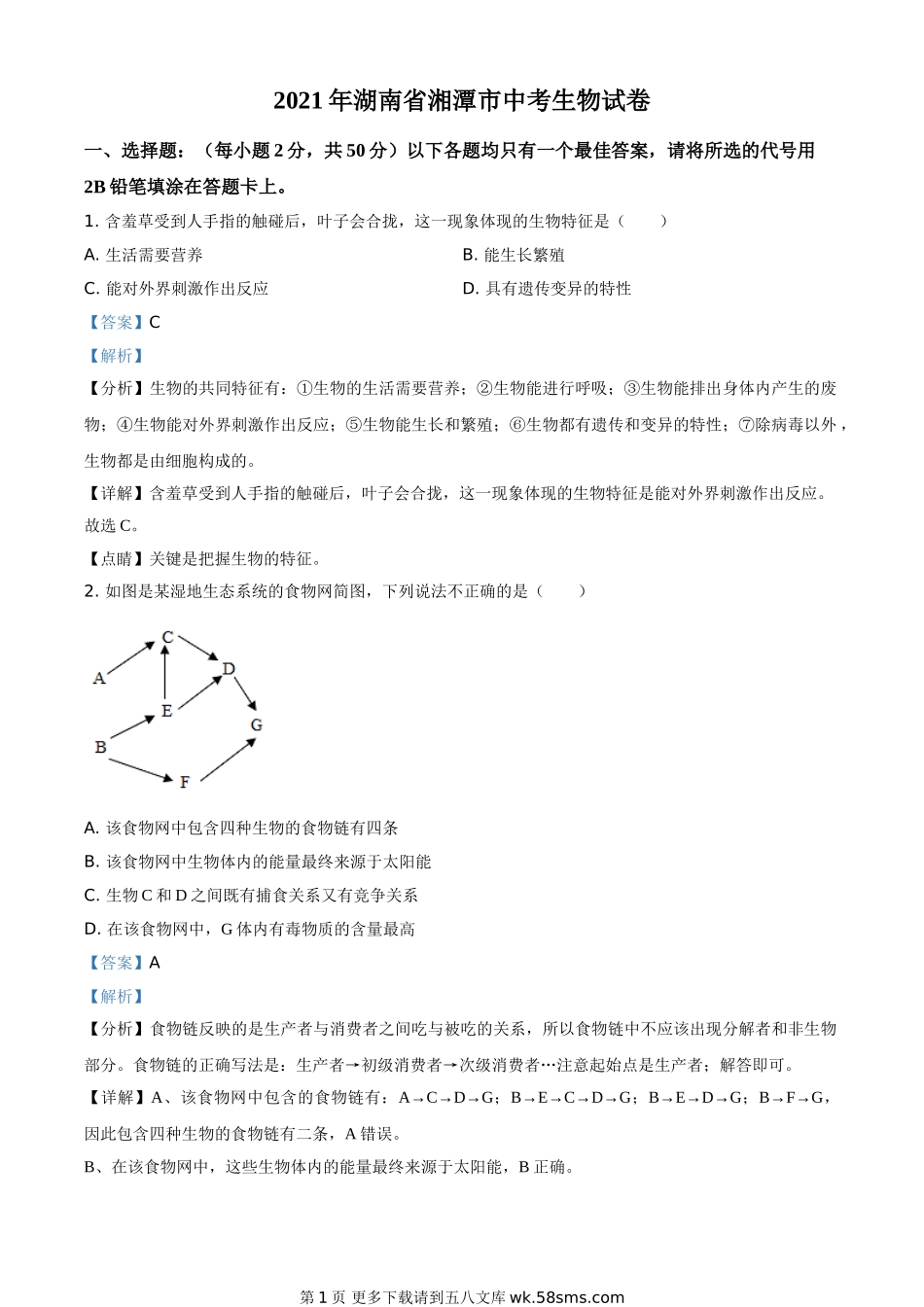 湖南省湘潭市2021年中考生物试题(解析版).doc_第2页