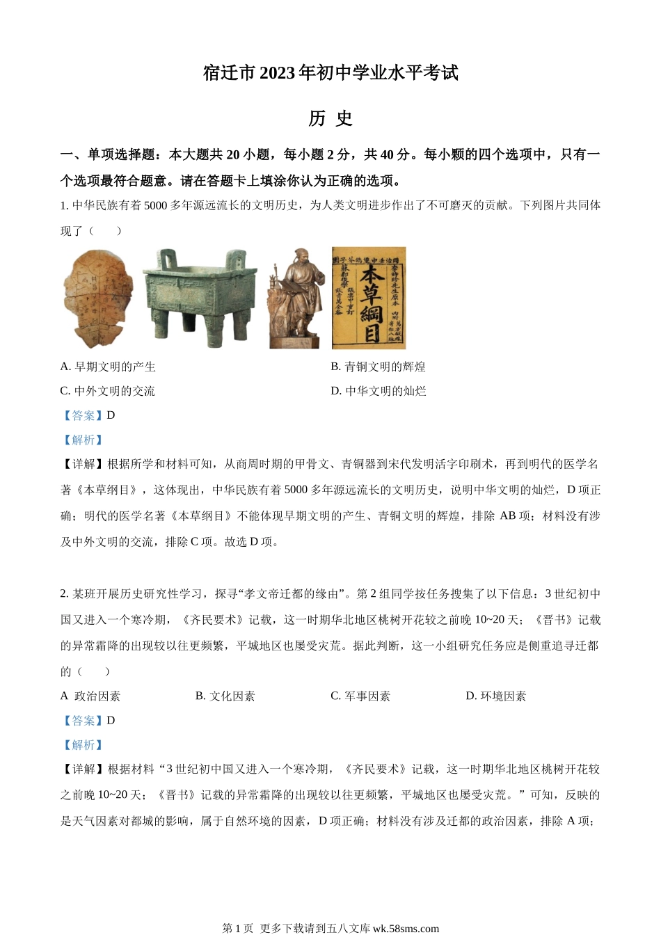 宿迁市2023年初中学业水平考试历史一、单项选择题:本大题共20小题,每小题2分,共40分。每小颗的四个选项中,只有一个选项最符合题意。请在答题卡上填涂你认为正确的选项。1.中华民族有着5000多年源远流长的文明...