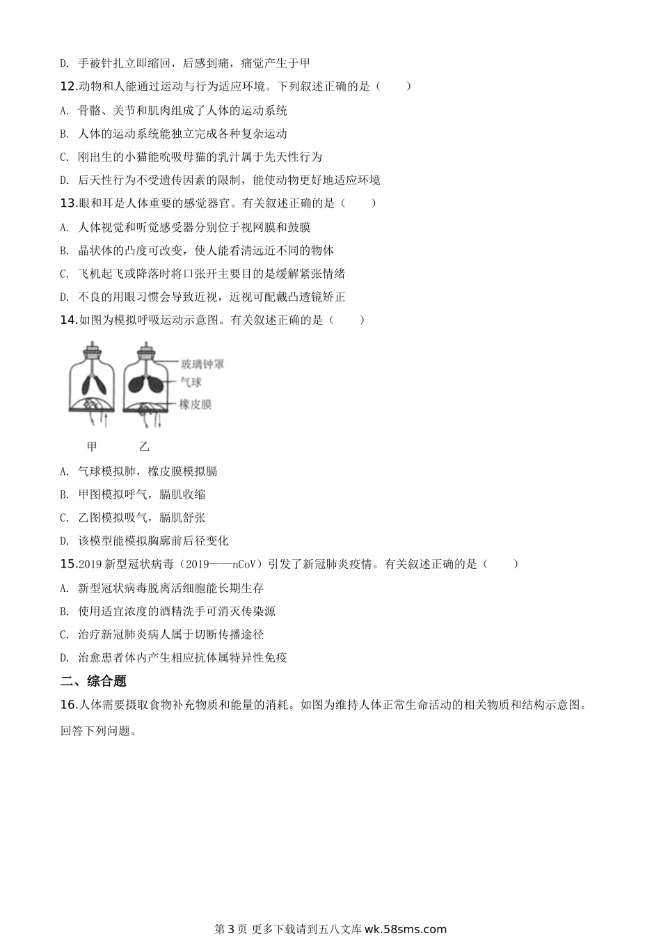2020年江苏省连云港市中考生物试题(原卷版).doc_第3页