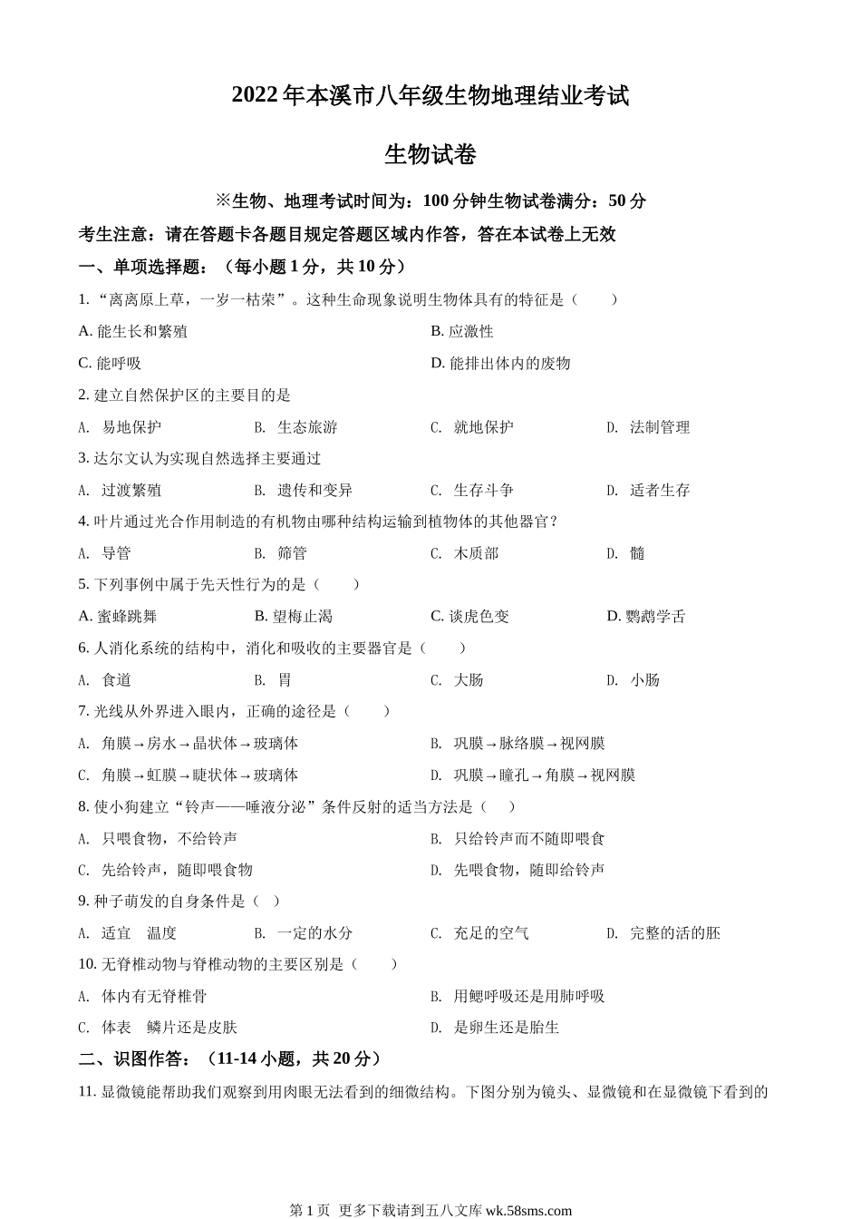 2022年本溪市八年级生物地理结业考试生物试卷※生物、地理考试时间为:100分钟生物试卷满分:50分考生注意:请在答题卡各题目规定答题区域内作答,答在本试卷上无效一、单项选择题:(每小题1分,共10分)1.“离...