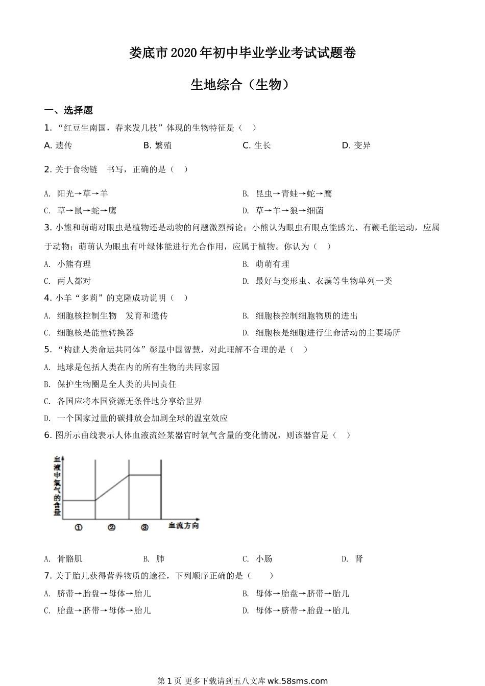 娄底市2020年初中毕业学业考试试题卷生地综合(生物)一、选择题1.“红豆生南国,春来发几枝”体现的生物特征是()A.遗传B.繁殖C.生长D.变异2.关于食物链的书写,正确的是()A.阳光→草→羊B.昆虫→青蛙→蛇→...
