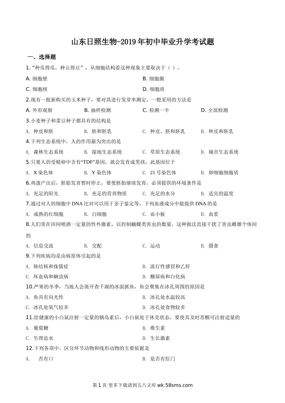 山东日照生物-2019年初中毕业升学考试题一、选择题1.“种瓜得瓜,种豆得豆”,从细胞结构看这种现象主要取决于()。A.细胞壁B.细胞膜C.细胞核D.细胞质2.现有一批新购买的玉米种子,要对其进行发芽率测定,一般采...