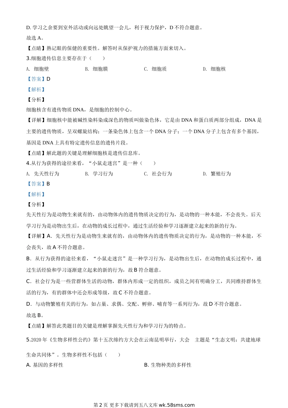 湖北省襄阳市2020年中考生物试题(解析版).doc_第2页