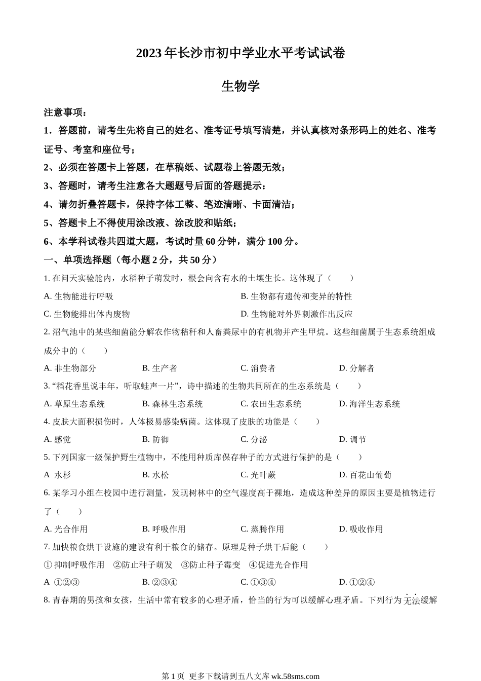 2023年长沙市初中学业水平考试试卷生物学注意事项:1.答题前,请考生先将自己的姓名、准考证号填写清楚,并认真核对条形码上的姓名、准考证号、考室和座位号;2、必须在答题卡上答题,在草稿纸、试题卷上答题无...