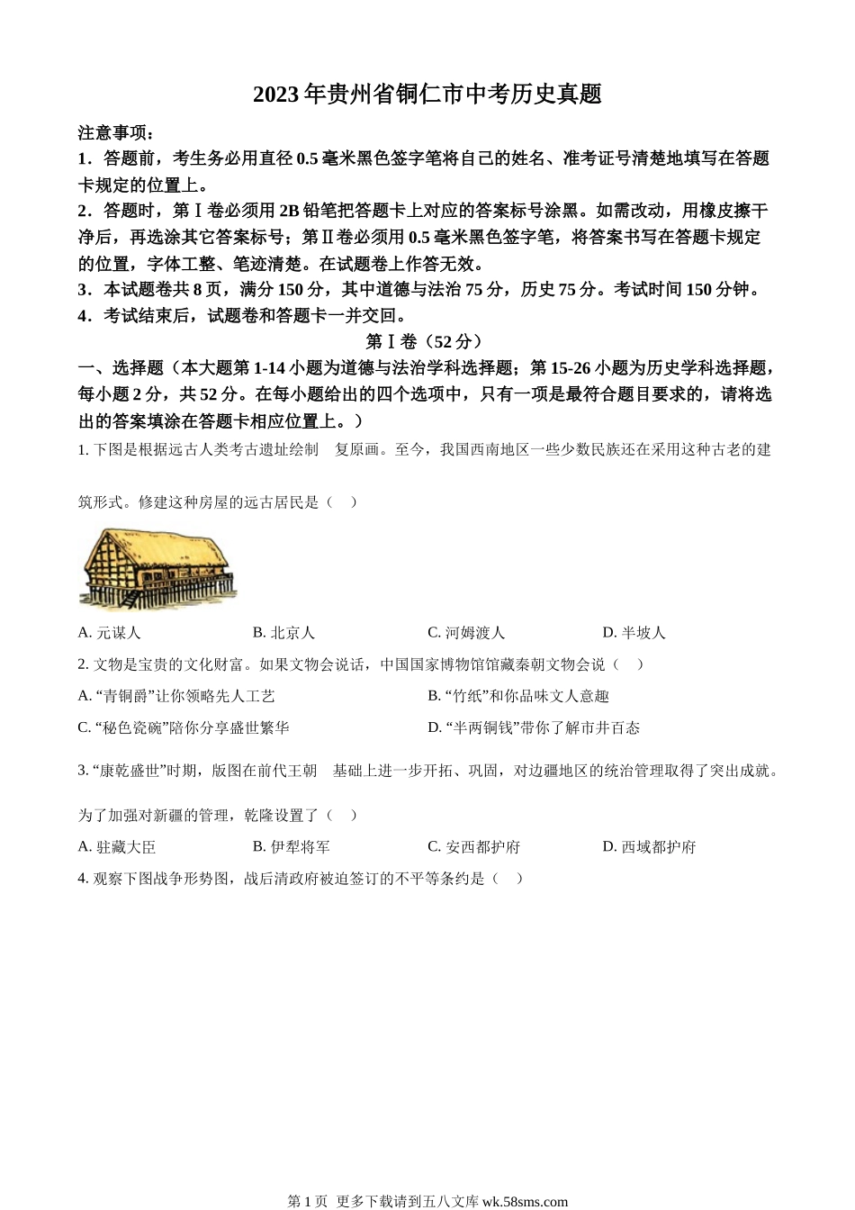 2023年贵州省铜仁市中考历史真题注意事项:1.答题前,考生务必用直径0.5毫米黑色签字笔将自己的姓名、准考证号清楚地填写在答题卡规定的位置上。2.答题时,第Ⅰ卷必须用2B铅笔把答题卡上对应的答案标号涂黑。如...