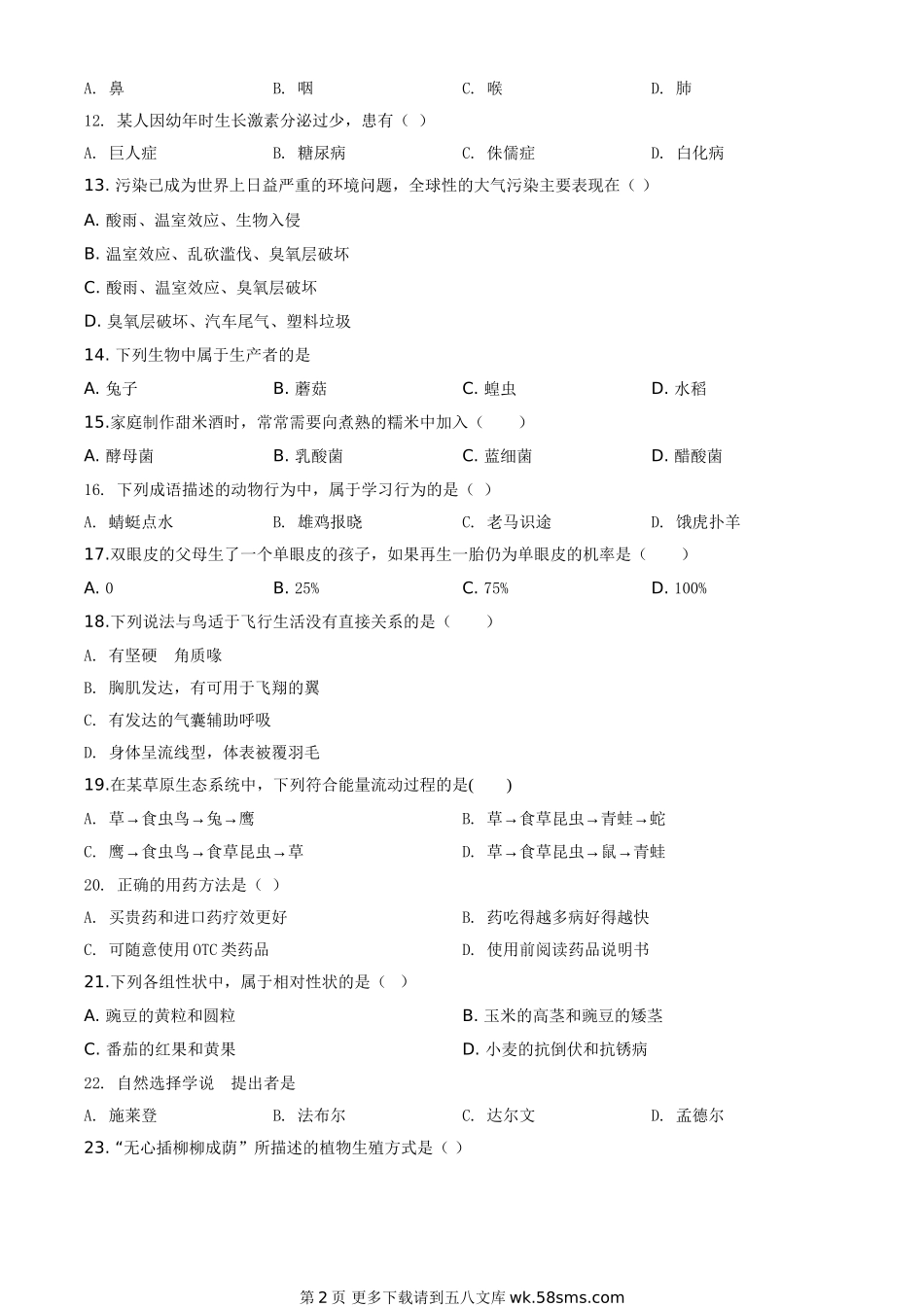 黑龙江省牡丹江、鸡西地区朝鲜族学校2020年中考生物试题(原卷版).doc_第2页