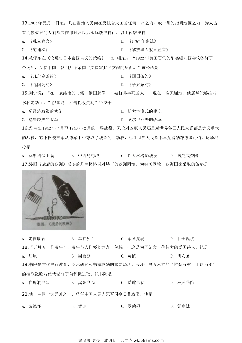 湖南省郴州市2020年中考历史试题(原卷版).doc_第3页