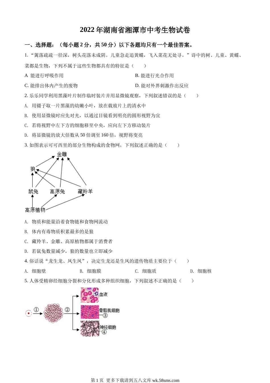 2022年湖南省湘潭市中考生物试题(原卷版).docx_第1页