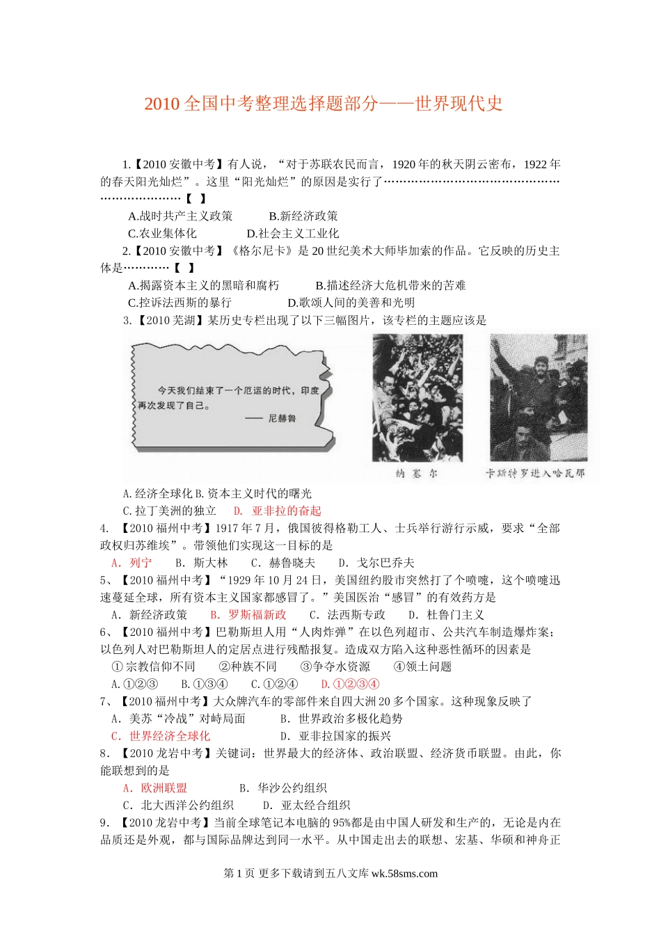 2010年全国中考历史真题按课标汇编--世界现代史.doc_第1页