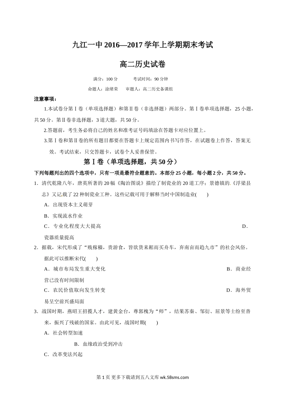 九江一中2016—2017学年上学期期末考试高二历史试卷满分:100分考试时间:90分钟命题人:涂绪荣审题人:高二历史备课组注意事项:1.本试卷分第Ⅰ卷(单项选择题)和第Ⅱ卷(非选择题)两部分。第Ⅰ卷单项选择题,...