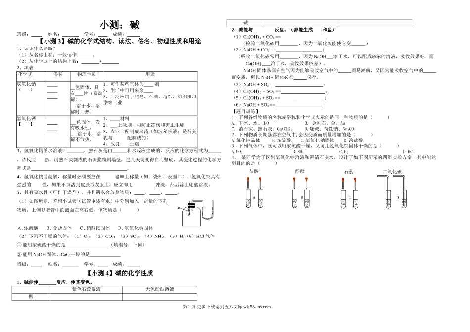 小测:碱班级:姓名:学号:成绩:【小测3】碱的化学式结构、读法、俗名、物理性质和用途1、认识什么是碱?(1)从名称上看:一般读作。(2)从化学式上的结构上看:+2、填表化学式俗名物理性质用途氢氧化钠()...