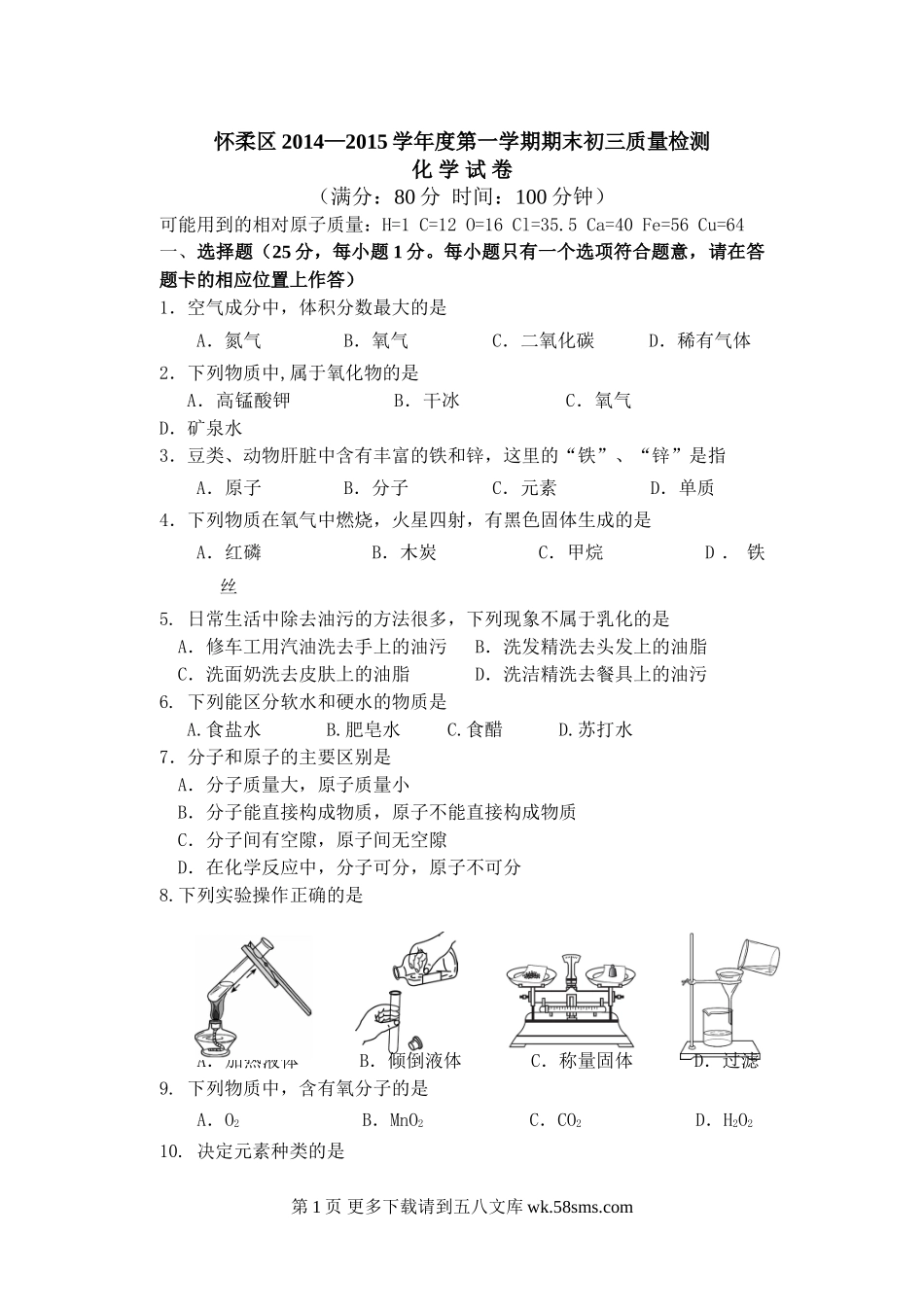 怀柔区2014—2015学年度第一学期期末初三质量检测化学试卷(满分:80分时间:100分钟)可能用到的相对原子质量:H=1C=12O=16Cl=35.5Ca=40Fe=56Cu=64一、选择题(25分,每小题1分。每小题只有一个选项符合题意,请...