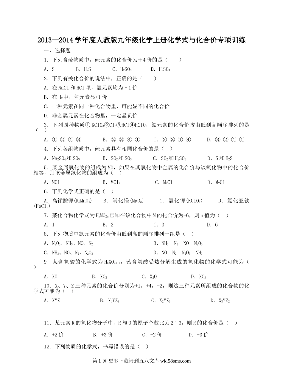 2013—2014年人教版九年级化学式与化合价专项训练.doc_第1页
