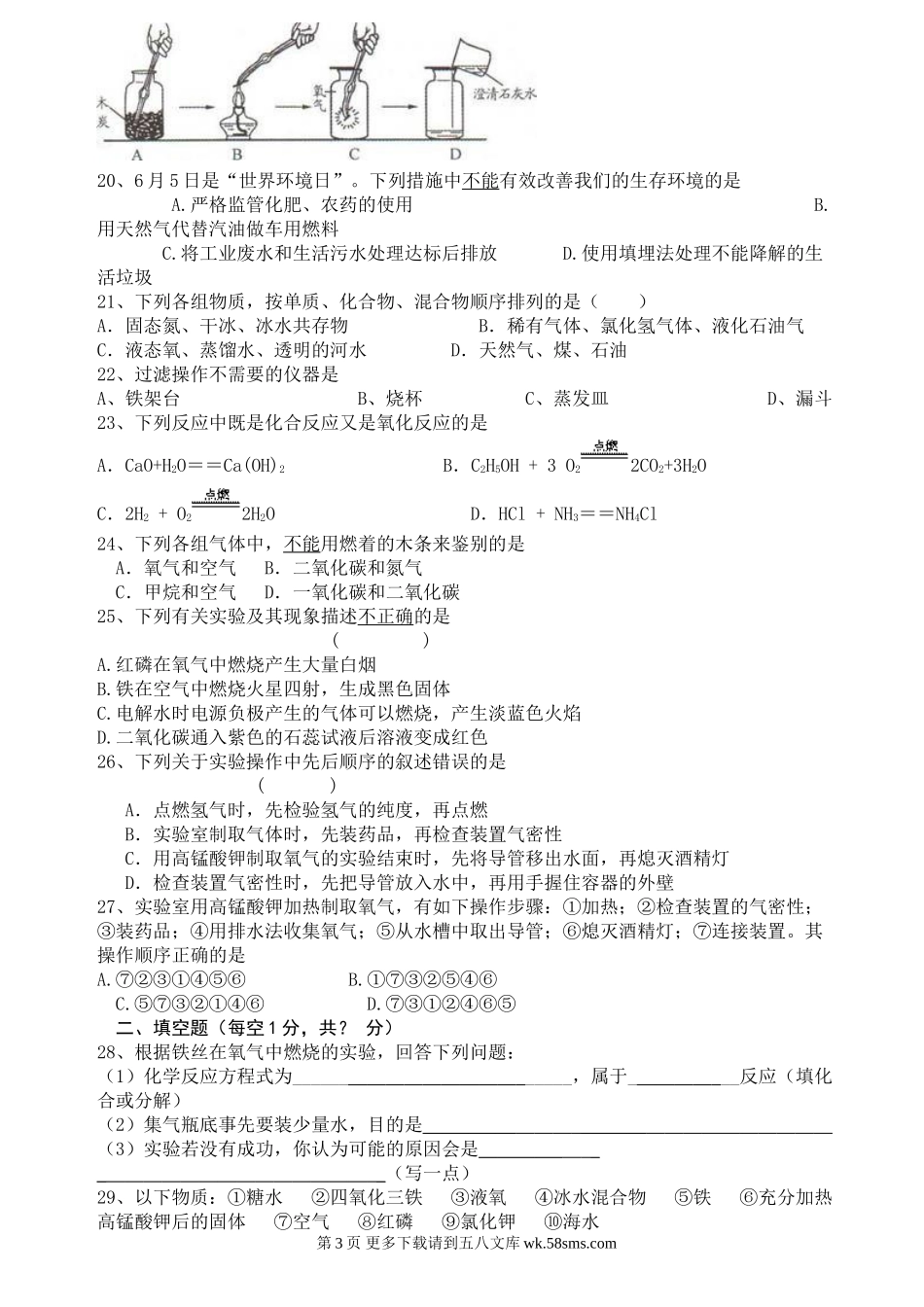 九年第一学期化学测试题(二)一、选择题(每题2分,共54分)1234567891011121314151617181920212223242526271、下列说法正确的是()A.空气本来是纯净物,但被污染后变成了混合物;B.矿泉水不是一种纯净物;C.空气...