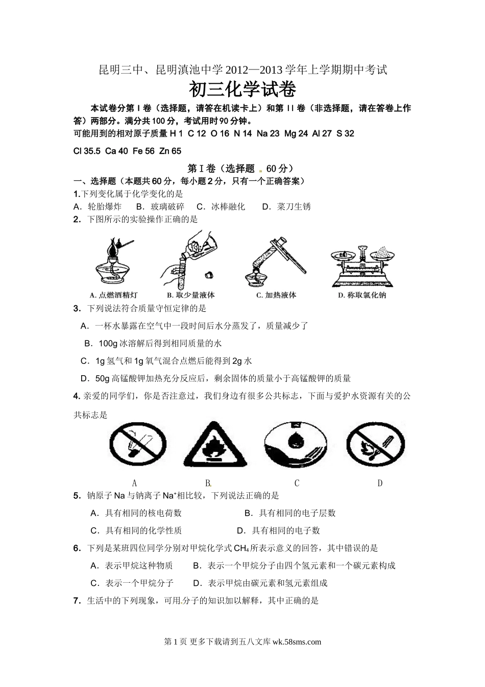 昆明三中、昆明滇池中学2012—2013学年上学期期中考试初三化学试卷本试卷分第I卷(选择题,请答在机读卡上)和第II卷(非选择题,请在答卷上作答)两部分。满分共100分,考试用时90分钟。可能用到的相对原子质量H...