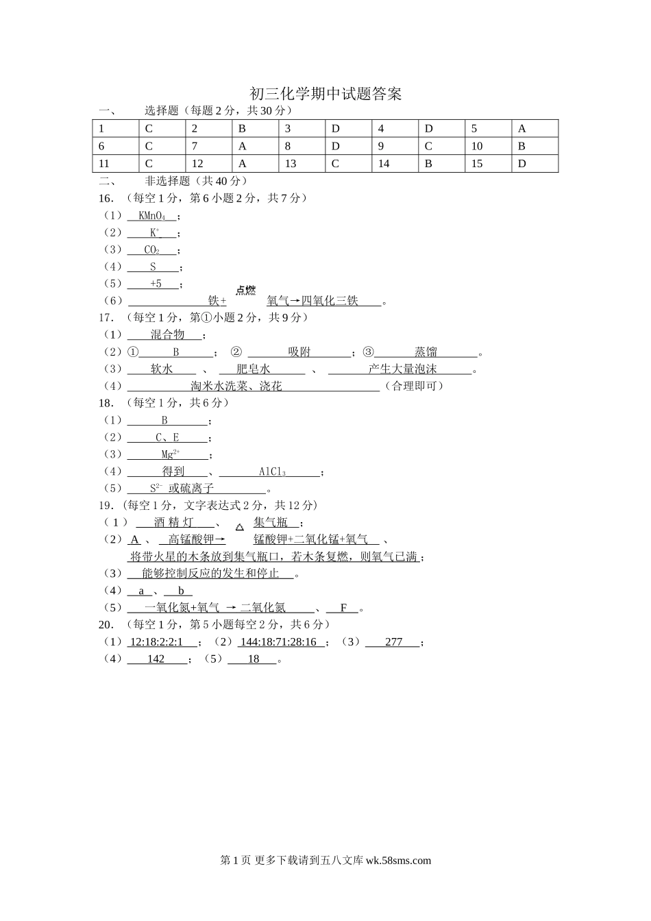 初三化学期中试题答案一、选择题(每题2分,共30分)1C2B3D4D5A6C7A8D9C10B11C12A13C14B15D二、非选择题(共40分)16.(每空1分,第6小题2分,共7分)(1)KMnO4;(2)K+;(3)CO2;(4)S;(5)+5;(6)铁+...
